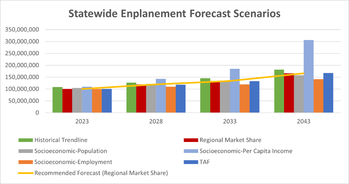 Activity forecasts are critical to evaluating needs and demands related exclusively to aviation activity. Chapter 6 summarizes the methods used to asses existing aviation activity and project future activity at Florida’s system airports. The chapter also discusses recommended forecast scenarios for based aircraft, general aviation operations, commercial/air taxi operations, and enplanements. Appendix D Aviation Activity Forecasts provides greater detail of these various scenarios.